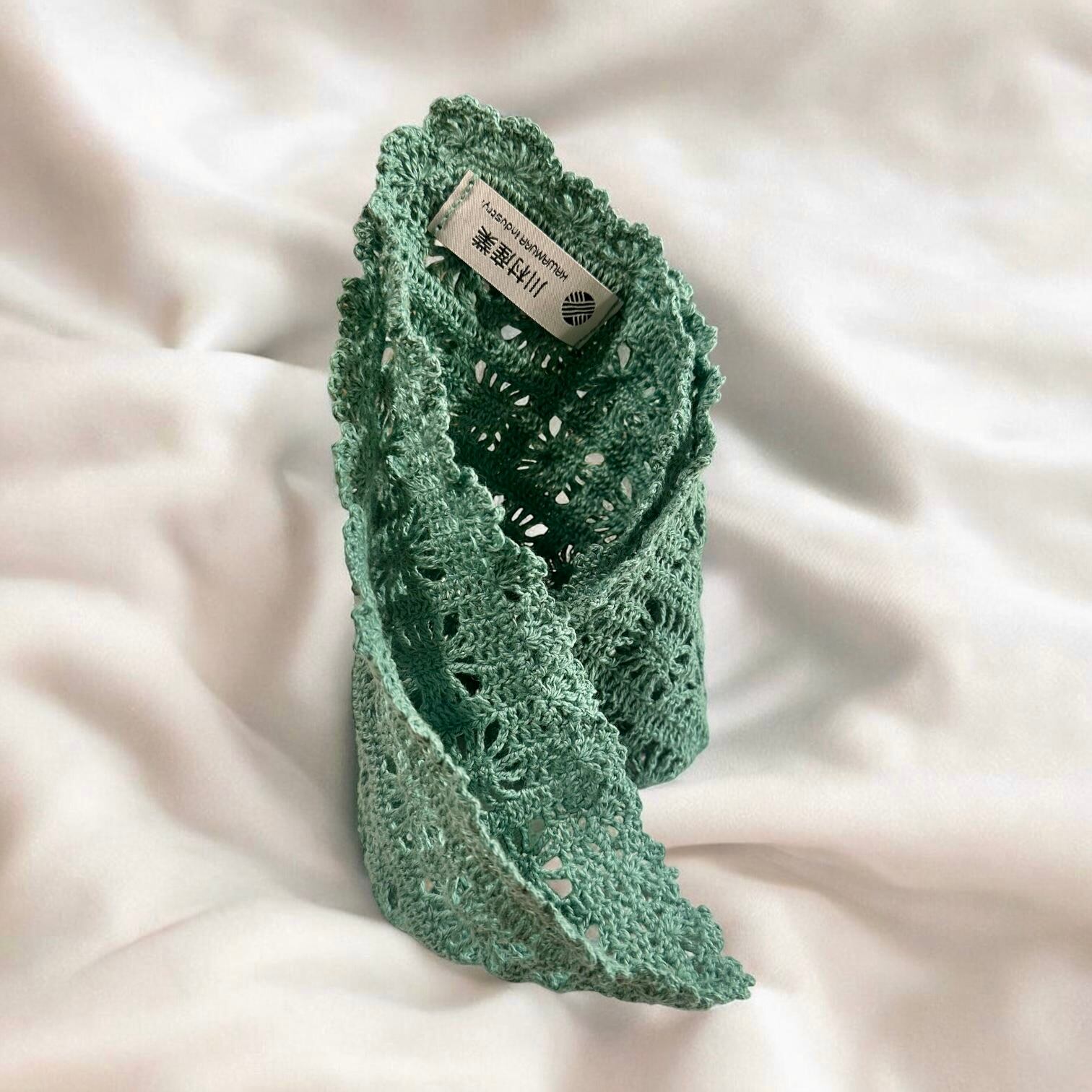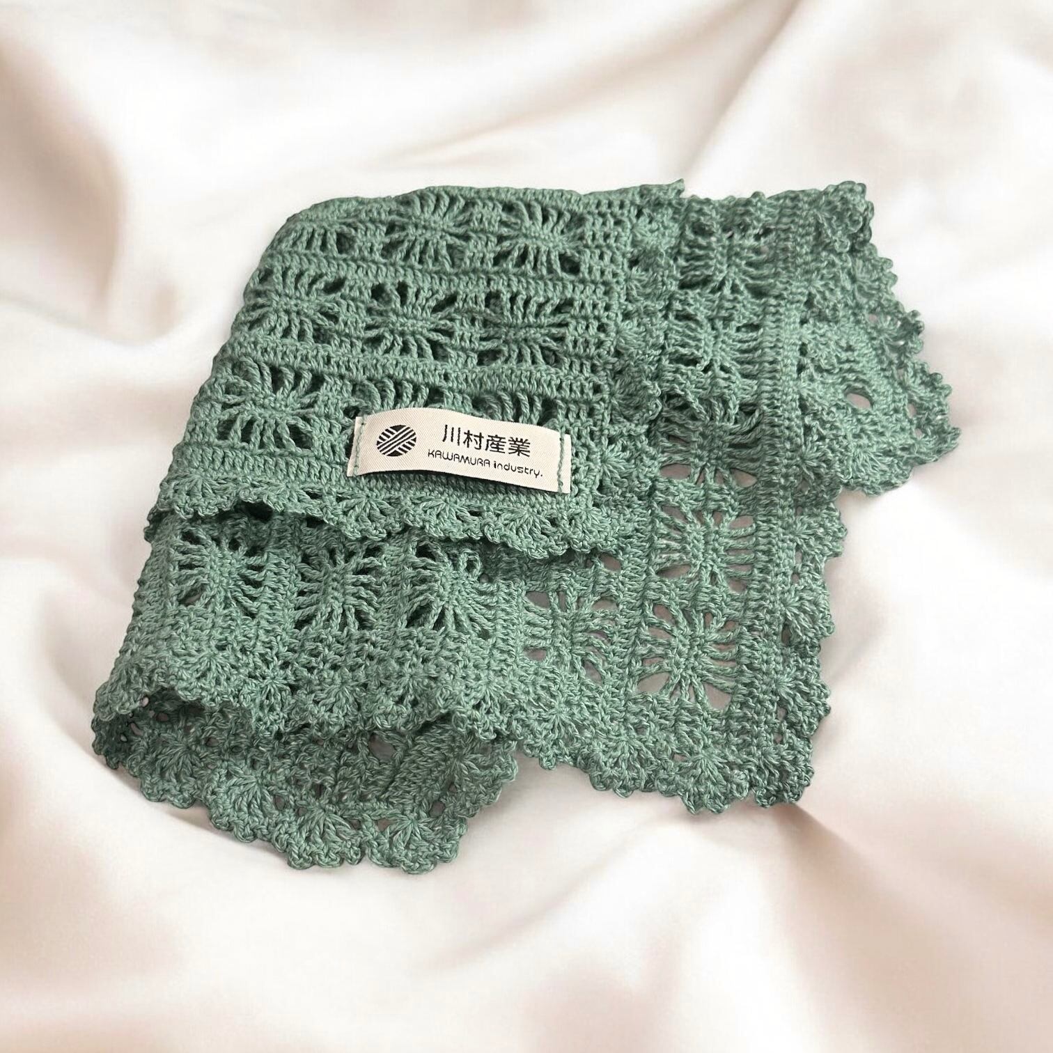 ターコイズブルーのコットンで編まれた、レース編みのハンカチです。